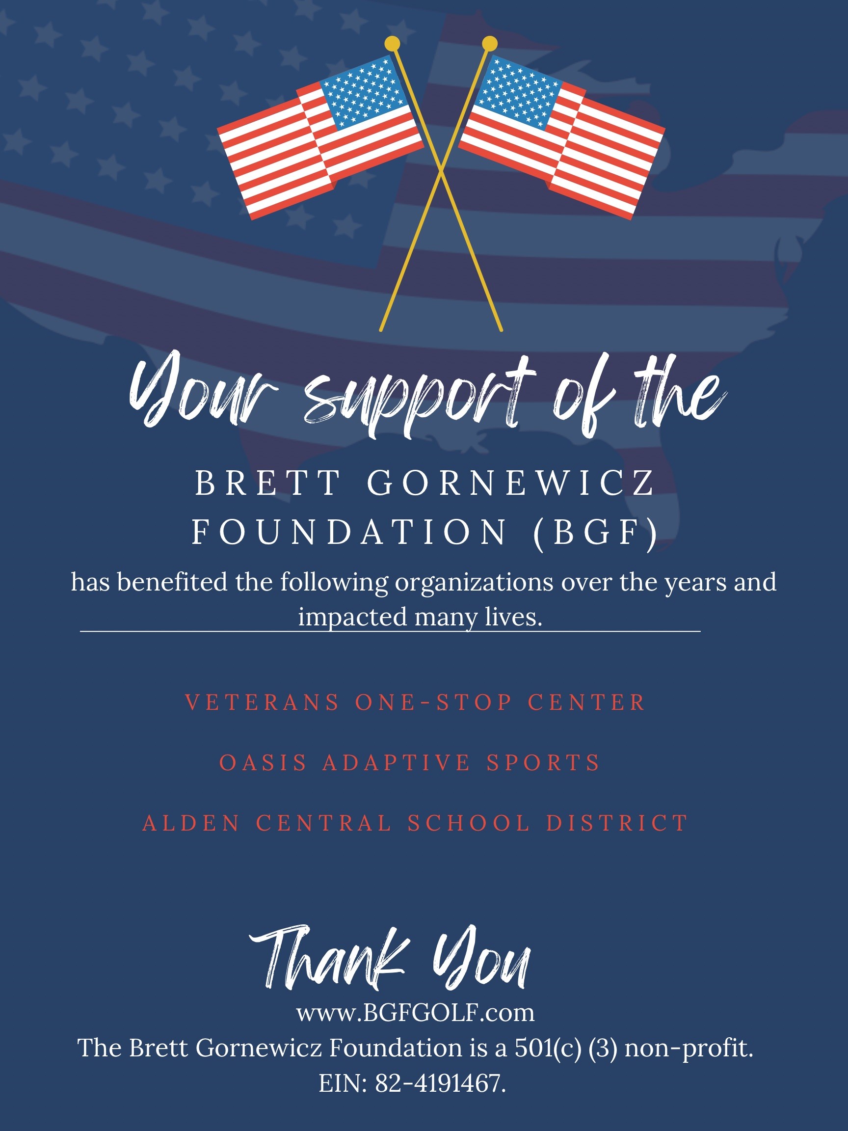The Brett Gornewicz Foundation (BGF) hosts an annual memorial golf tournament that brings friends, family, and the community together to honor Brett and his sacrifice. The event is filled with competition, food, drinks, raffles and prizes. Proceeds from the tournament benefit WNY veteran associations and local scholarships.